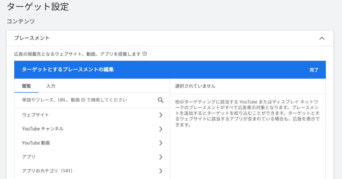 前述のとおりデマンドジェネレーションにはGDNの配信面を含めることができますが、『特定のサイトだけに配信する』といった細かい制御ができるのはGDNのみです。下記はGDNの入稿画面ですが、このようなプレースメント指定はデマンドジェネレーションではできません。