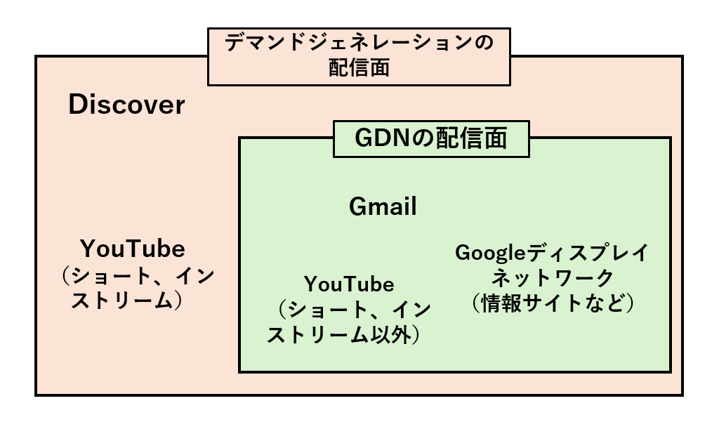 GDNもデマンドジェネレーションも「YouTube」や「Gmail」に広告が出ます。また、デマンドジェネレーションキャンペーンでGDNの配信面を含めることもできます。