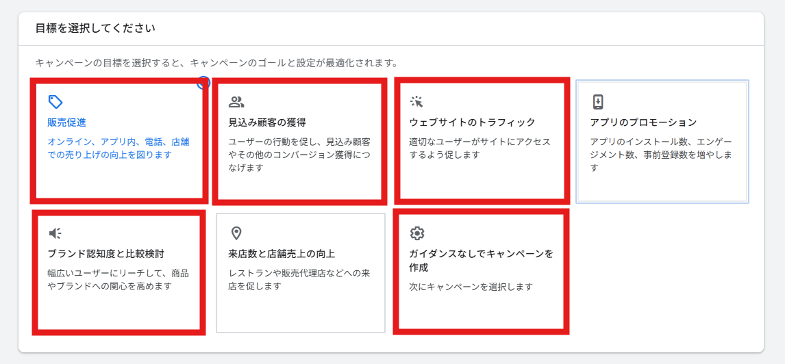 デマンドジェネレーション広告は、キャンペーン目標を下記に設定すると出稿できます。迷ったら「ガイダンスなしでキャンペーンを作成」することもできます。