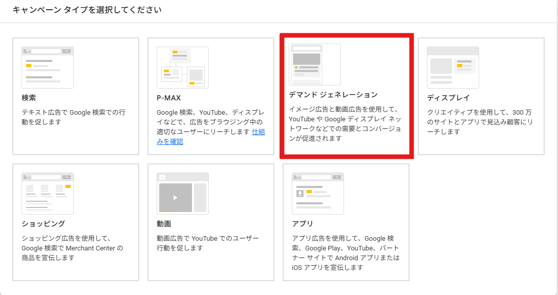 GoogleDiscoverに配信できるのは、デマンドジェネレーション広告のみです。