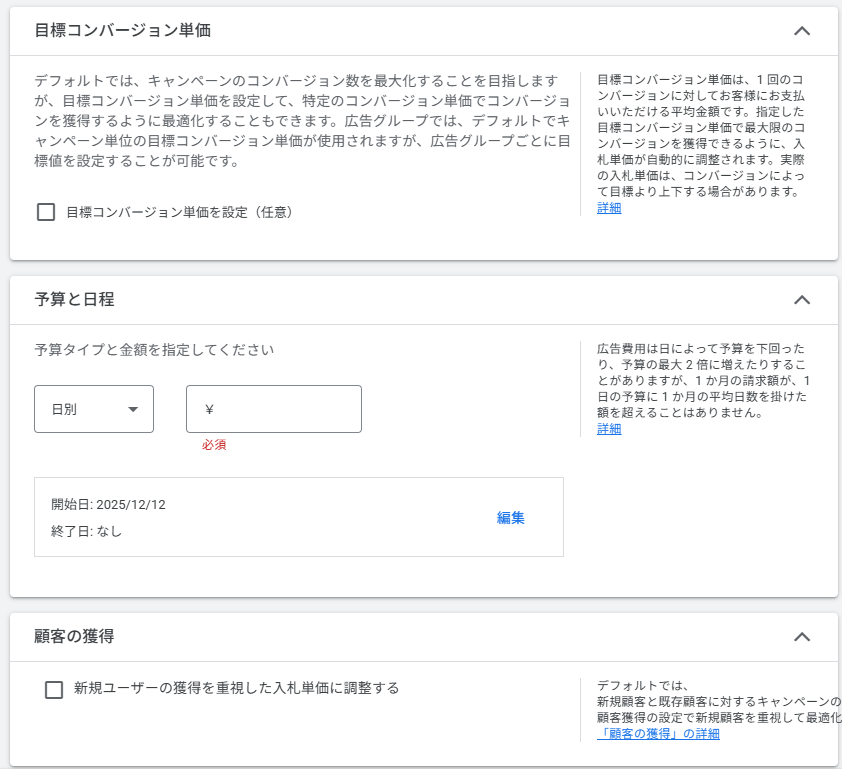 目標コンバージョン単価(任意)、予算と日程、顧客の獲得に関する設定を行います。目標コンバージョン単価は「コンバージョン1件あたりの単価目標を決めておく」設定です。特に目標を定めず、なるべく安く獲得したいというだけであれば設定は不要です。