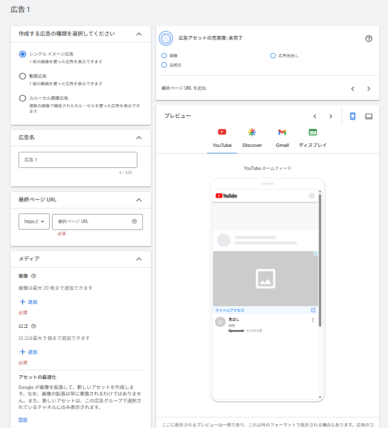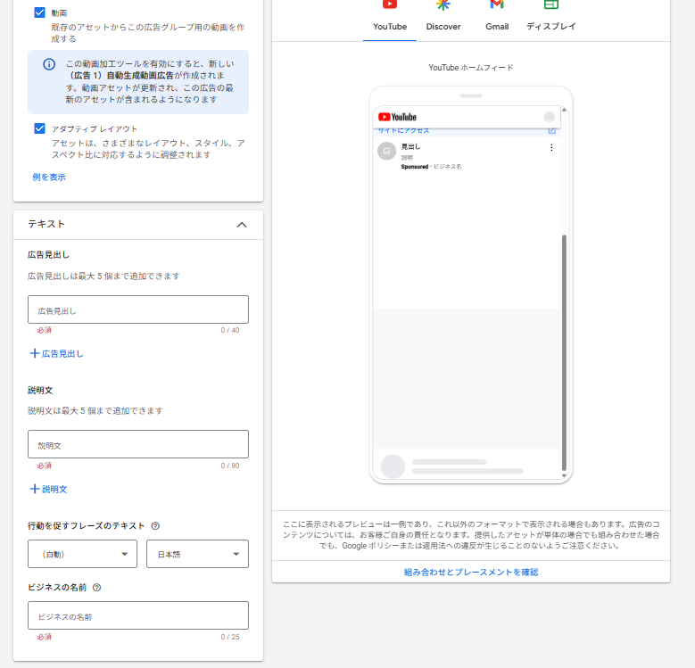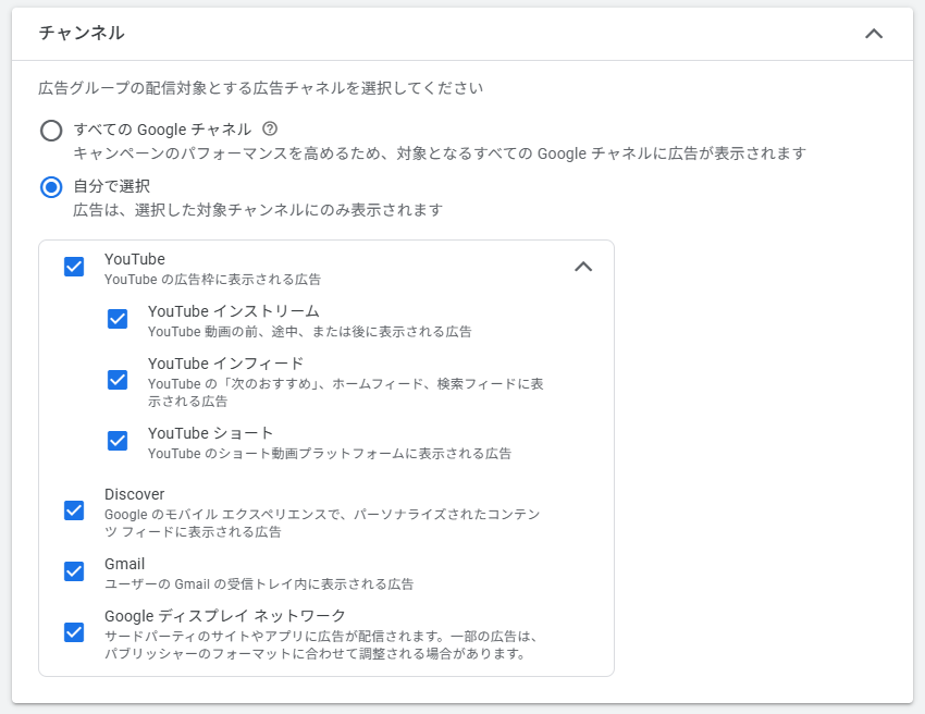 | 配信先 | Google Discover YouTubeホームフィード Gmail | Youtubeインストリーム Youtubeショート |