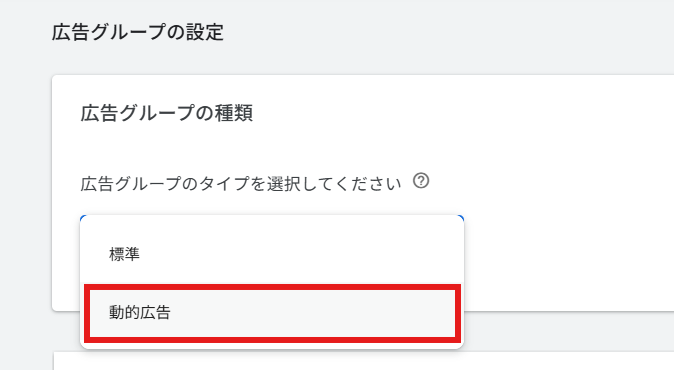 新規広告グループの入稿画面に進み、広告グループの種類を「動的広告」にします。