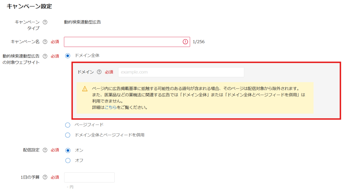 | キャンペーン | キャンペーンタイプ | – | 動的検索連動型広告(DAS) |
