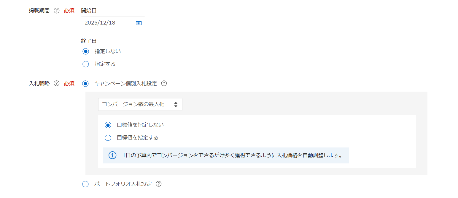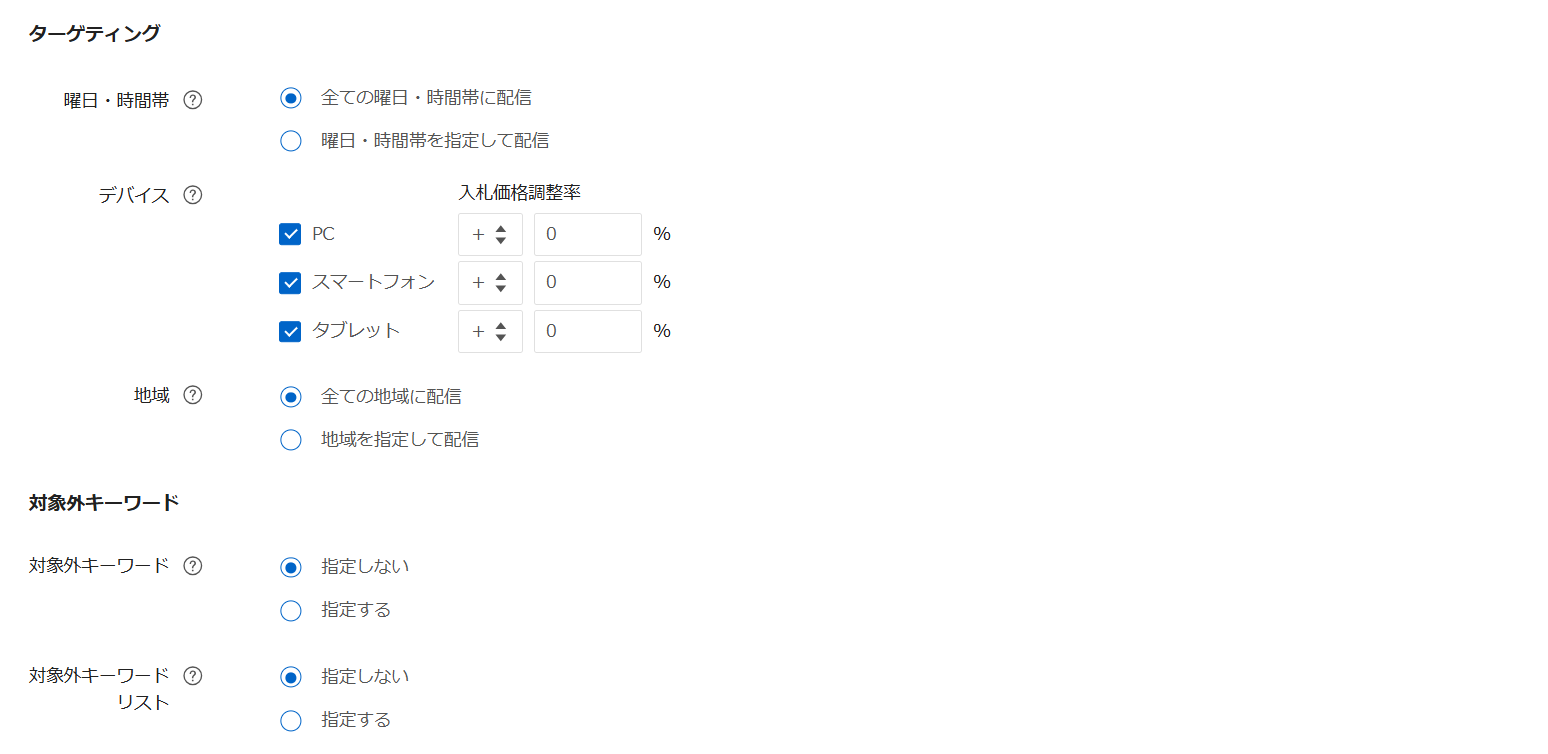 | ターゲティング設定(デバイス・地域・曜日・時間帯) | – | 設定しない | |