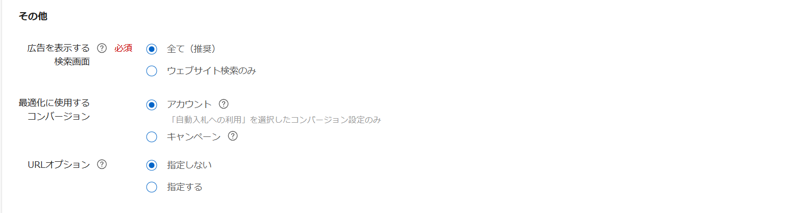 | 広告掲載方式の設定 | – | 検索を含むすべての広告掲載方式 | |