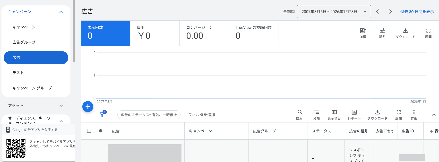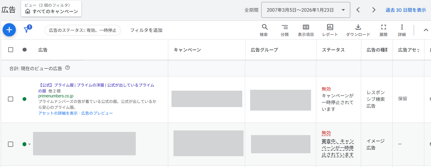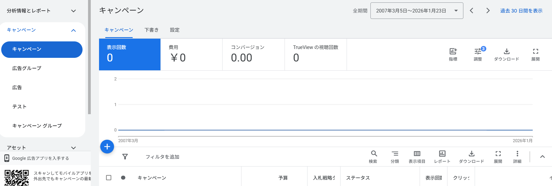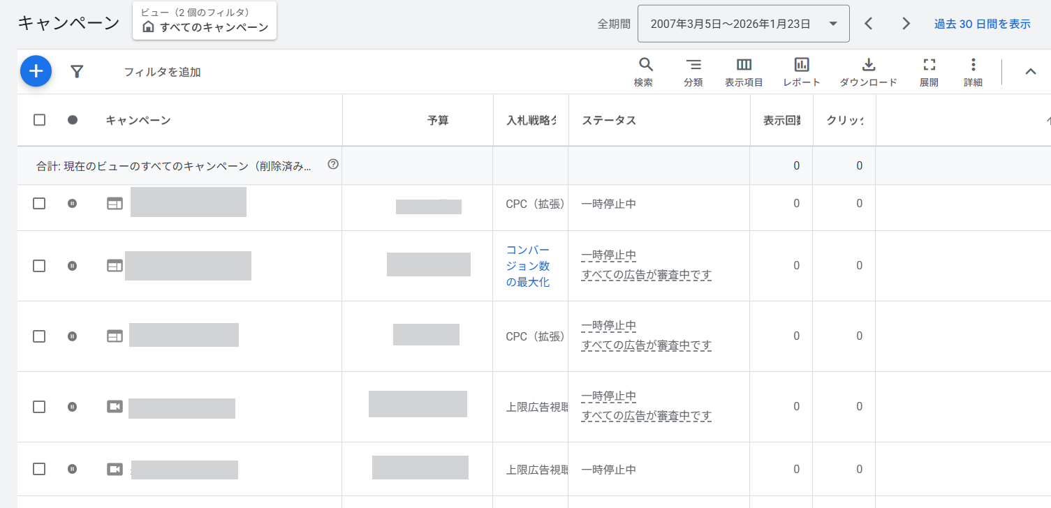 キャンペーン画面は、Google広告運用における中心的な操作画面です。ここでは以下のような操作が可能です。