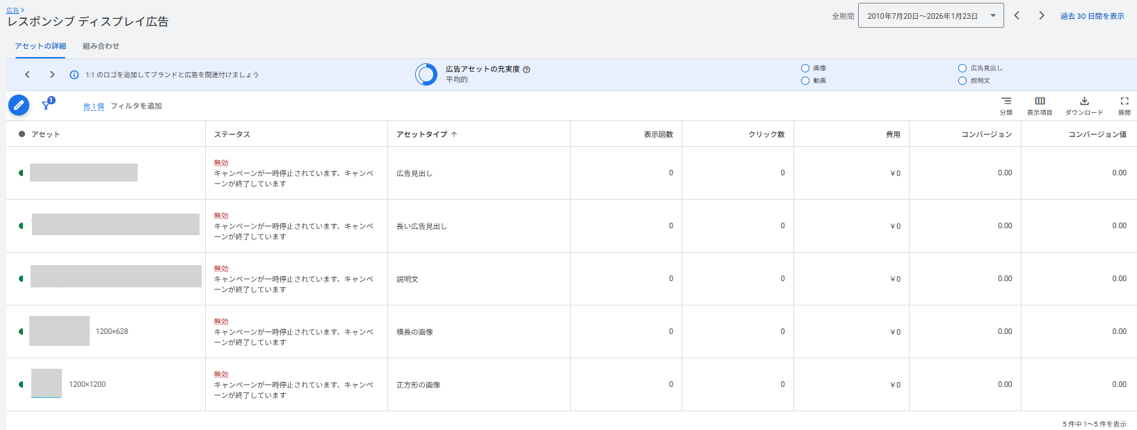 広告の種類が「レスポンシブディスプレイ広告」の場合は「アセットの詳細を表示」することができます。アセットとはレスポンシブ広告として組み合わせに使われる可能性がある広告見出し・説明文などのパーツのことです。それぞれの成果がどの程度か、アセット別に確認できます。