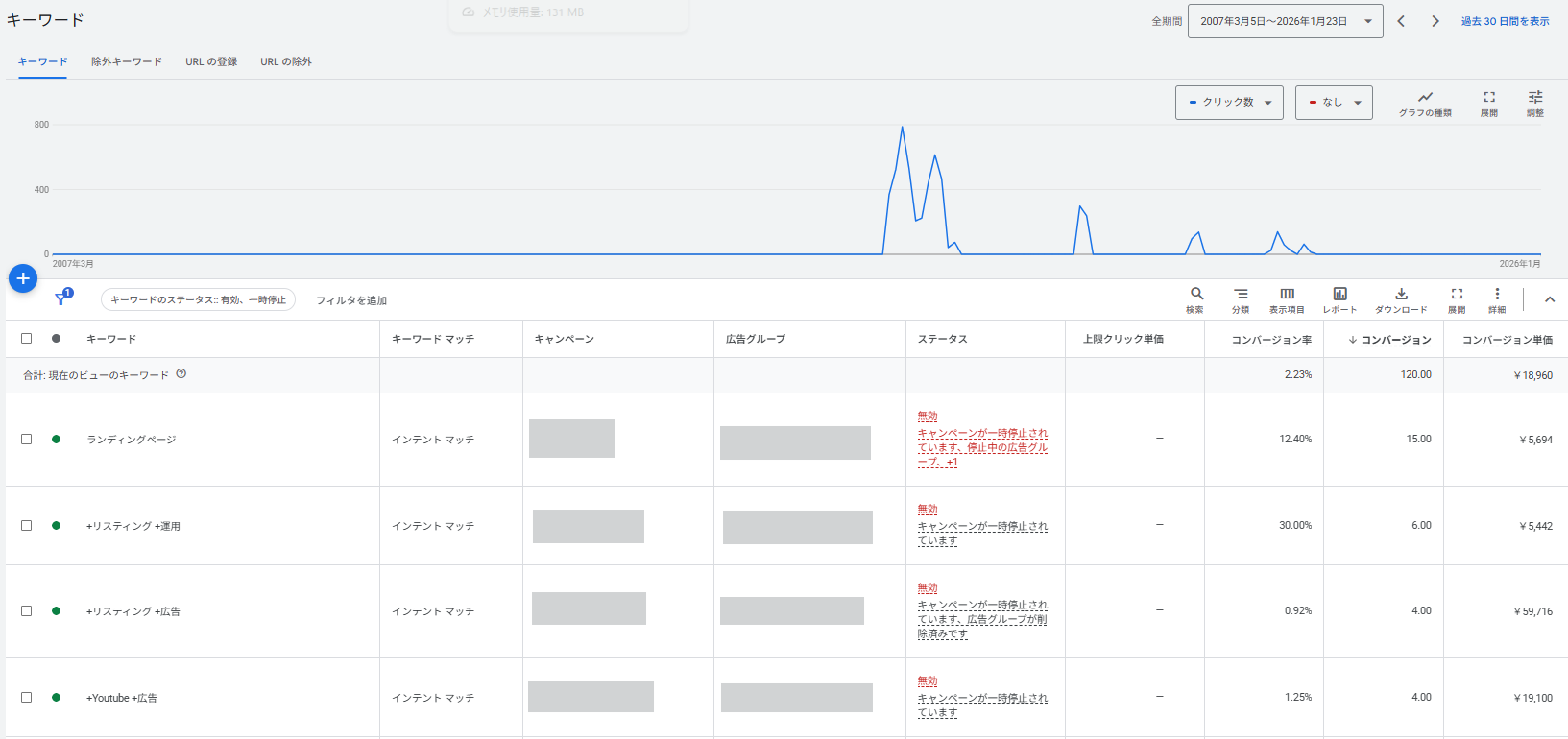 キャンペーン一覧:すべてのキャンペーンとその主要指標を一覧で確認できます。各キャンペーンの状態(有効、一時停止、終了など)、費用、クリック数、コンバージョン数などを並べて比較できます。