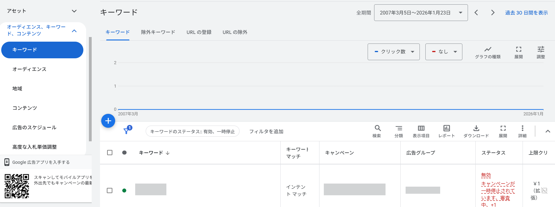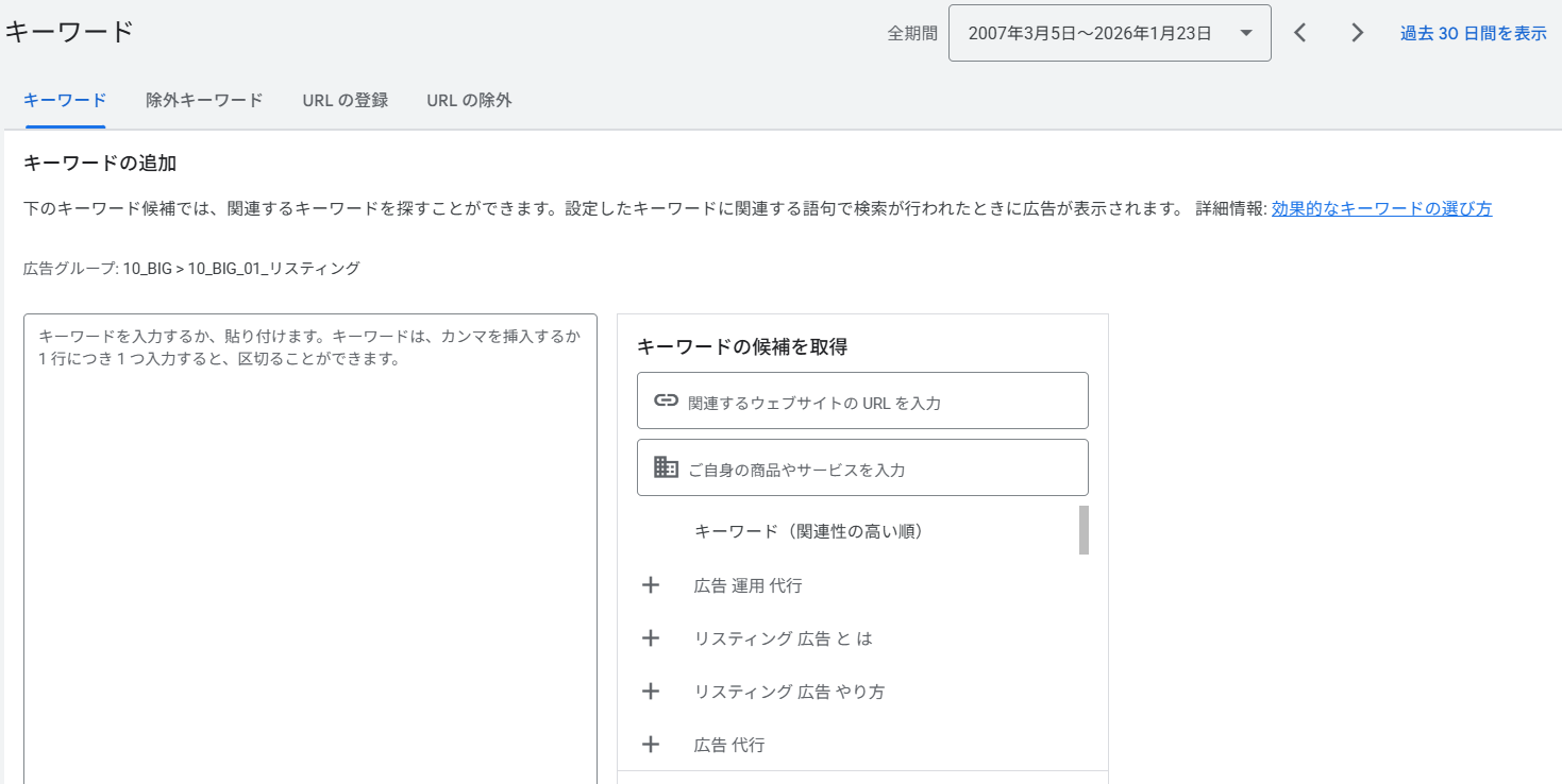 キーワード:検索キャンペーンで使用するキーワードを確認・編集するための画面です。