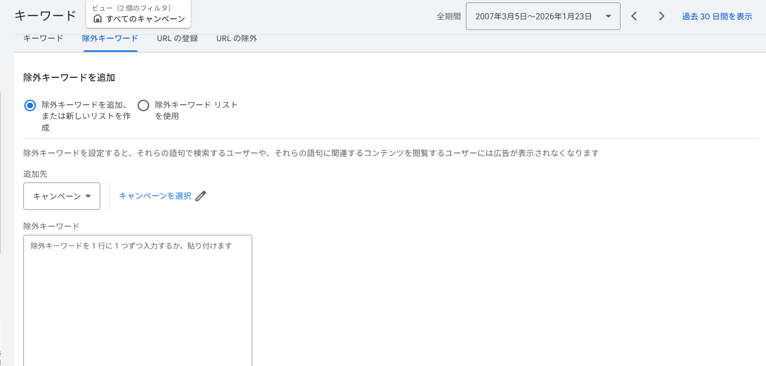 キーワードは広告の配信対象として設定するだけでなく「除外」することもできます。除外キーワードも先程同様の+ボタンから設定します。設定画面のタブを「除外キーワード」に切り替え、青い+から除外キーワードの追加画面に入ります。追加方法はキーワードと変わりません。