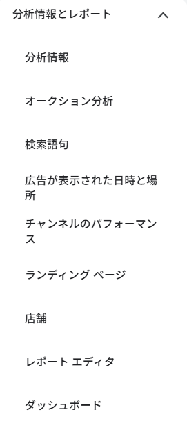 左側のメニュー内「分析情報とレポート」では、広告の成果をレポートにまとめて出力したり分析したりできます。よく使う機能をピックアップしてご紹介します。