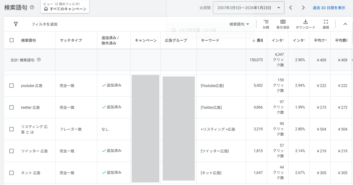 表を見ると、「どんな検索語句で」「どのキーワードが反応して」広告が表示されたかわかります。「追加済み/除外済み」の欄が「なし」になっている検索語句は、一致する言葉をキーワードとして登録していない状態です。そのクエリをキーワードとして登録すればもっと成果を伸ばせる可能性があることを示しています。定期的にチェックして新しいキーワードを取り入れるとよいでしょう。