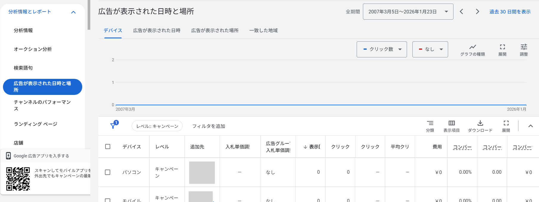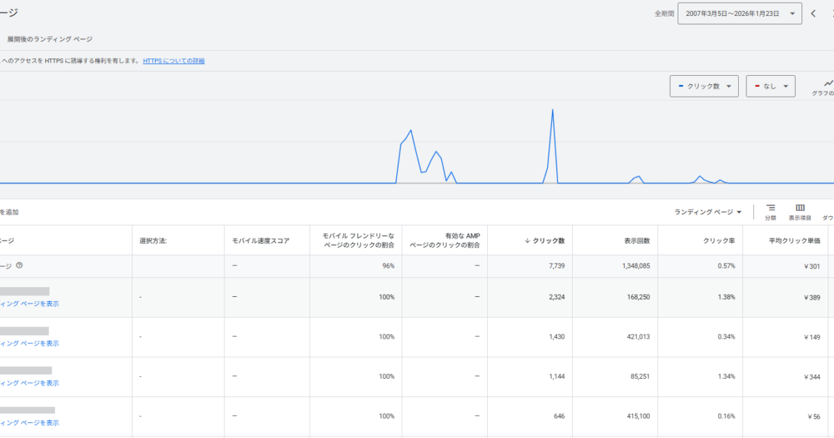 広告の飛び先として設定しているページのうち、どのページの成果が良いか確認できます。広告別に複数のリンク先を用意している場合には定期的に見ておきましょう。ランディングページのスコアは広告の品質スコアにも響きます。成果が出ないとき、広告の悪いのではなくランディングページの評価が良くなかった、ということもあり得ます。