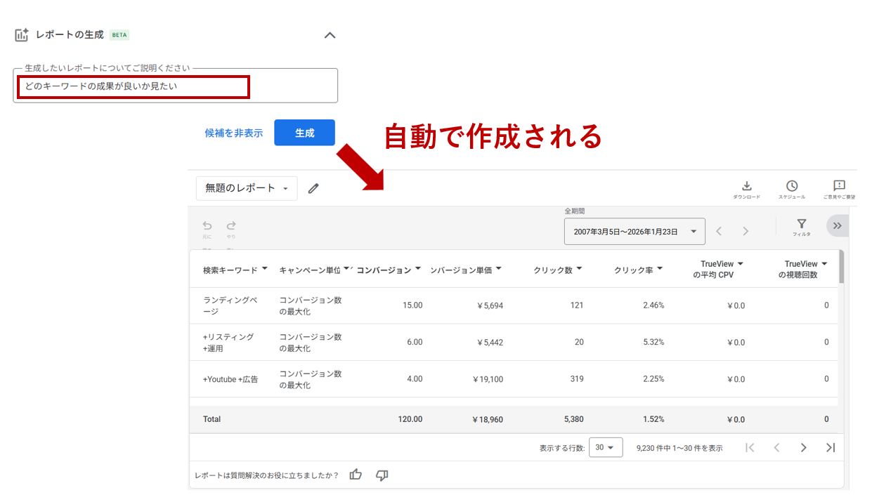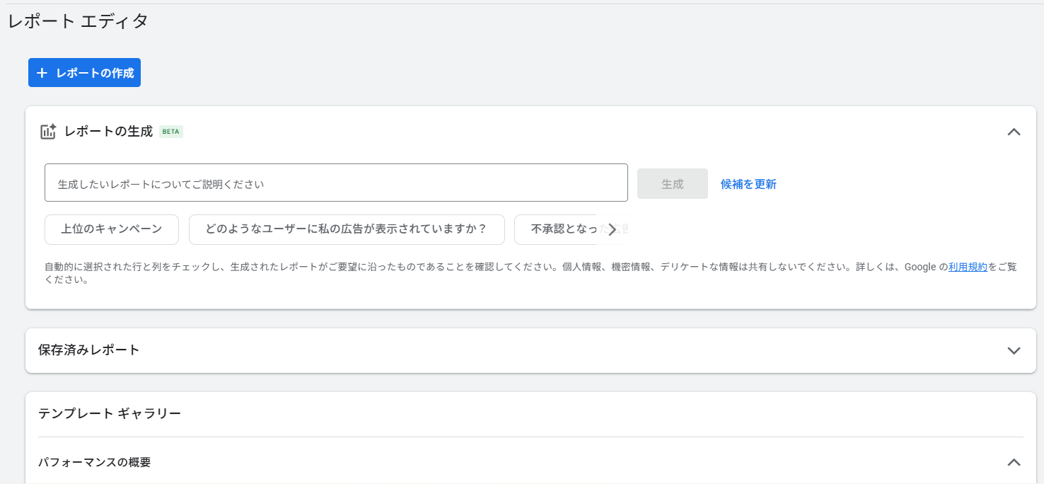 ちなみに、アカウントによっては(ベータ版として)作成したいレポートについてテキストで説明すると生成してくれる機能が使える場合があります。かなり楽なのでぜひお試しください。