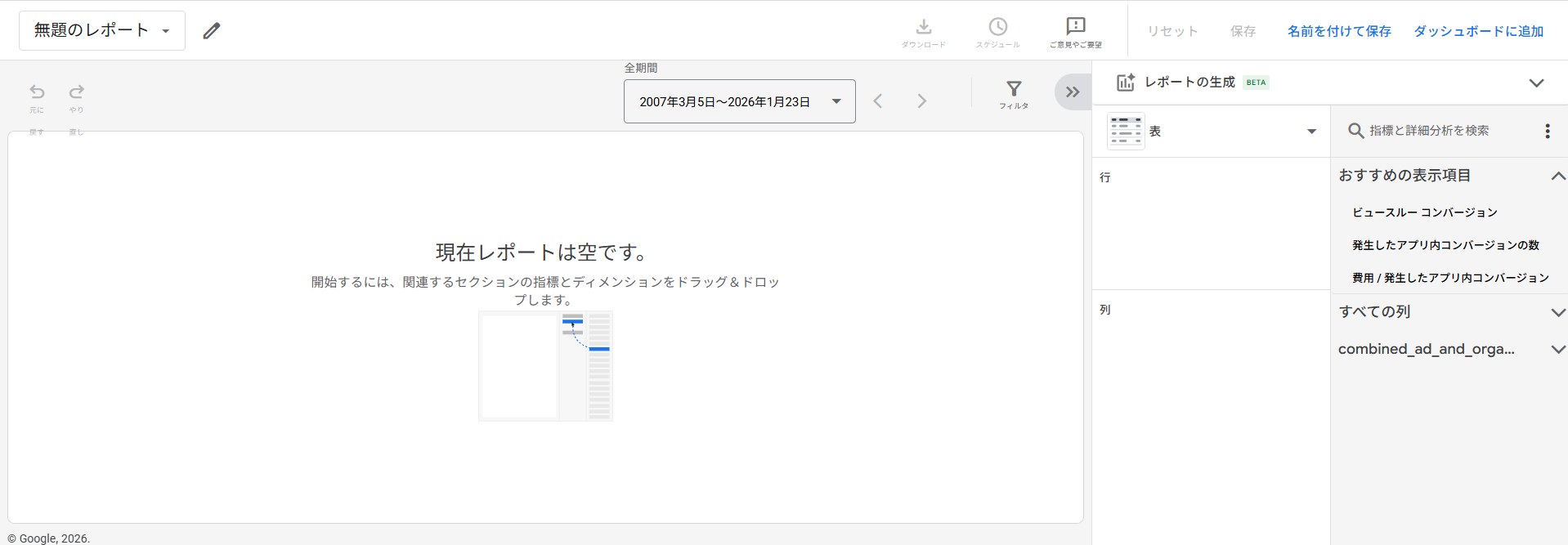 作成画面の右側から指標とディメンションをドラックして表を組み立てます。