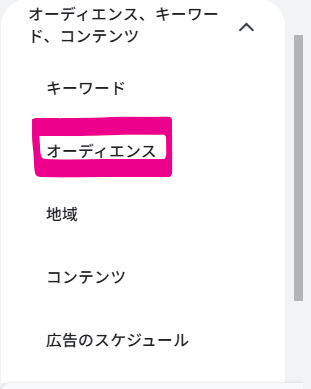 キャンペーン・広告の入稿時に設定することもできますが、管理画面左側のメニュー「オーディエンス」からも設定できます。