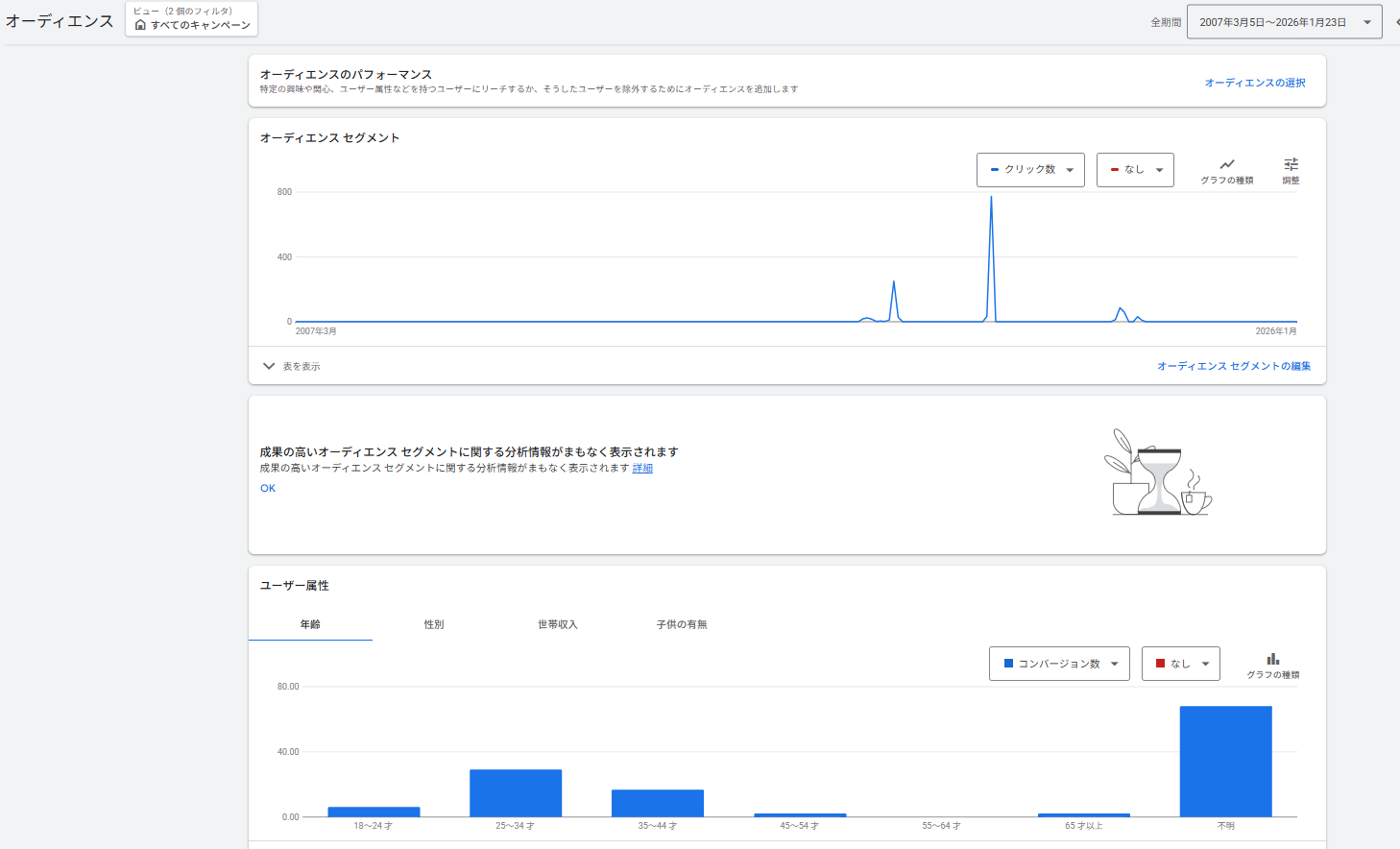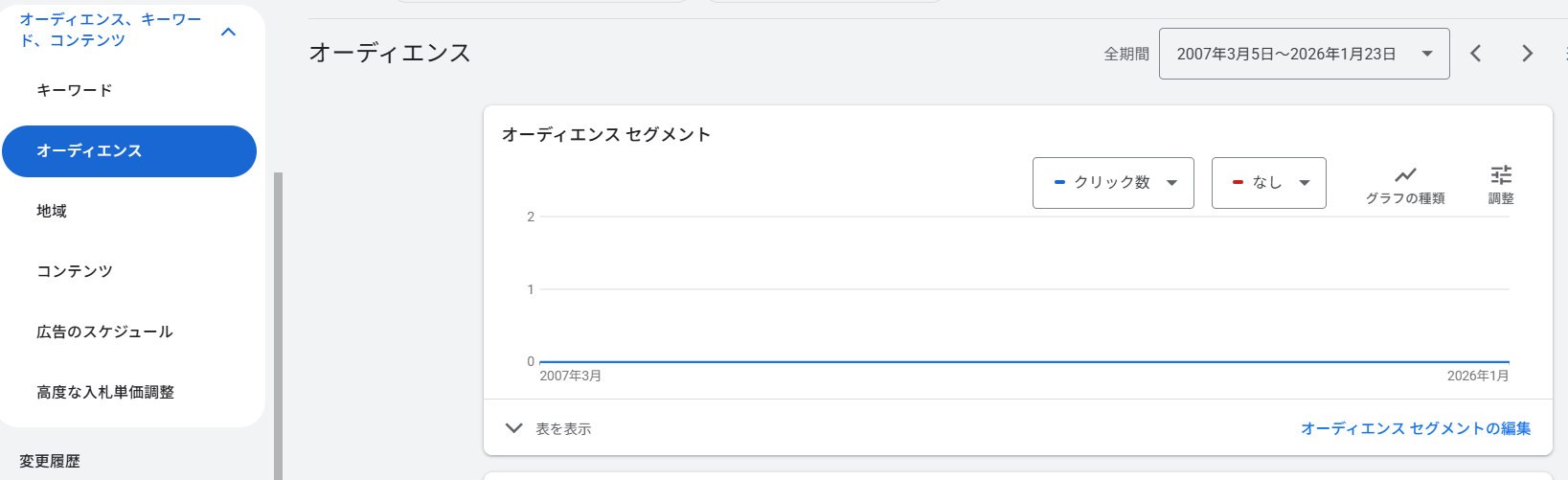 オーディエンス:ターゲットとするユーザー層を設定・確認するための画面です。