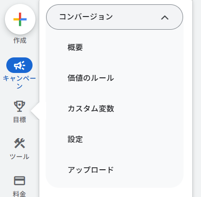 コンバージョン関連の設定は、管理画面左側メニューの「目標」から入れます。