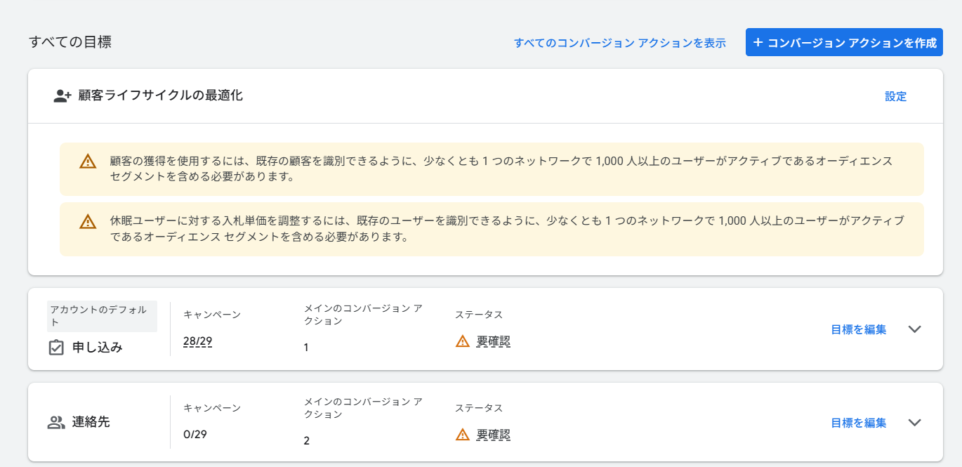 「概要」では、コンバージョンの設定状況を俯瞰で確認できます。
