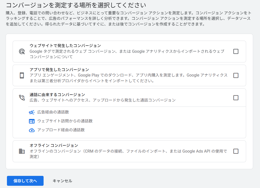 「コンバージョンアクションを作成」から、「どういうアクションをコンバージョンと定義するか」を設定できます。配信する広告の目的に応じて選択しましょう。