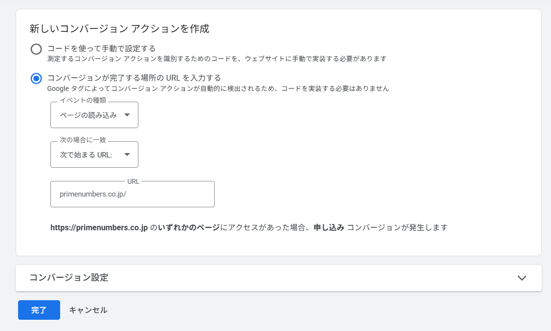 Googleタグがあれば、コンバージョンが発生する場所(サンクスページなど)のURLを設定することでコンバージョン計測ができるようになります。
