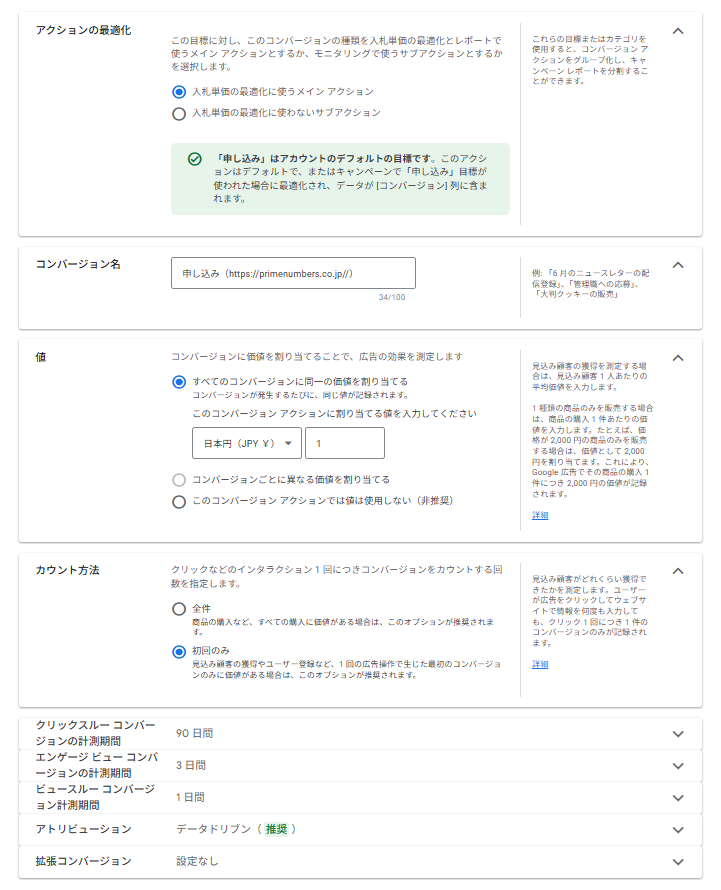 コンバージョンアクションの最適化やコンバージョン名、コンバージョンあたりの価値(商品の値段など)、カウント方法、計測期間などの設定も画面に従って完了しましょう。