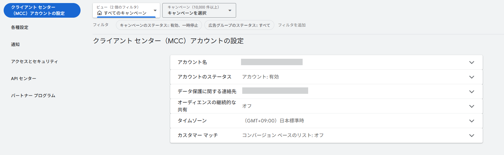 キャンペーン設定:各キャンペーンの1日の予算や入札戦略などの細かい設定を確認・変更できます。