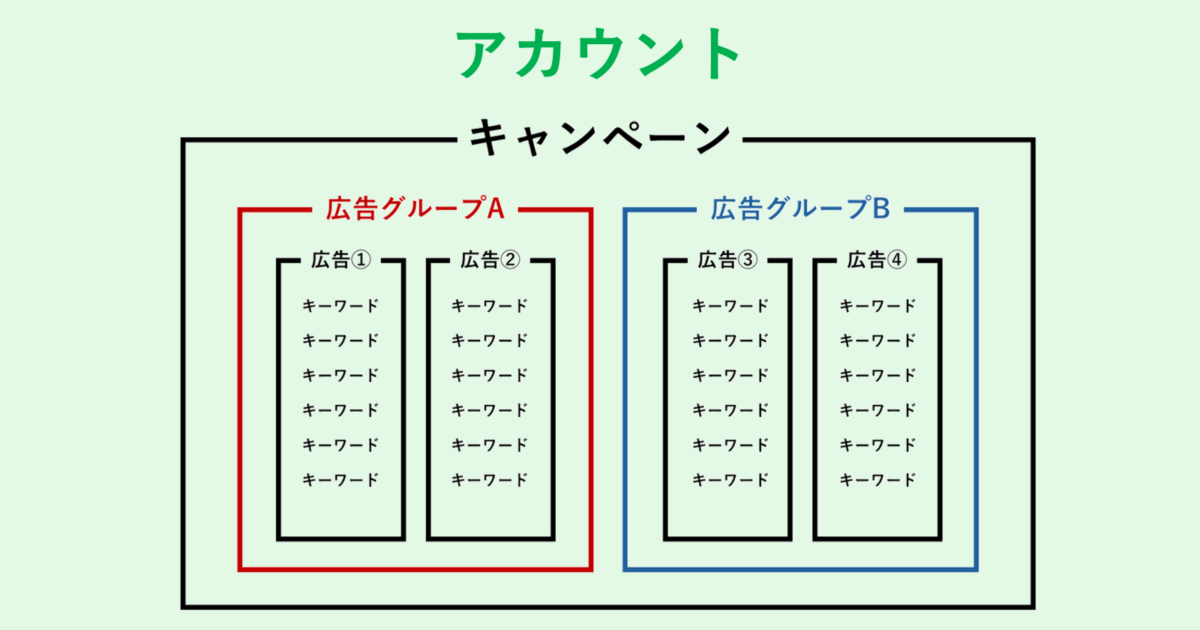 最下層にあたるのが「広告」と「キーワード」です。広告は実際にユーザーに表示される画像や広告文のことで、キーワードは検索広告において、どの検索語句に対して広告を表示するかを決めるものです。