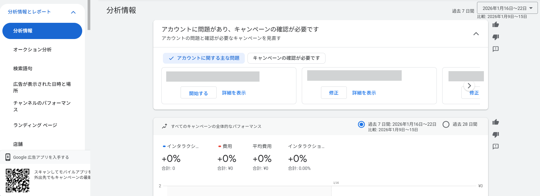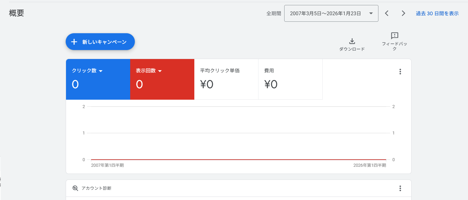 概要(ホーム):アカウント全体のパフォーマンスを、数値やグラフで一目で確認できるダッシュボード画面です。アカウント内の問題がある箇所の指摘が見られたり、アカウント内の広告やラベルなども一覧で見られます。