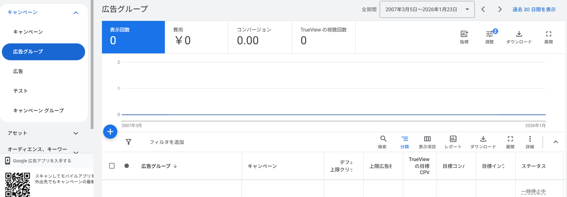 広告グループ:各キャンペーン内に紐づく広告グループを管理する画面です。