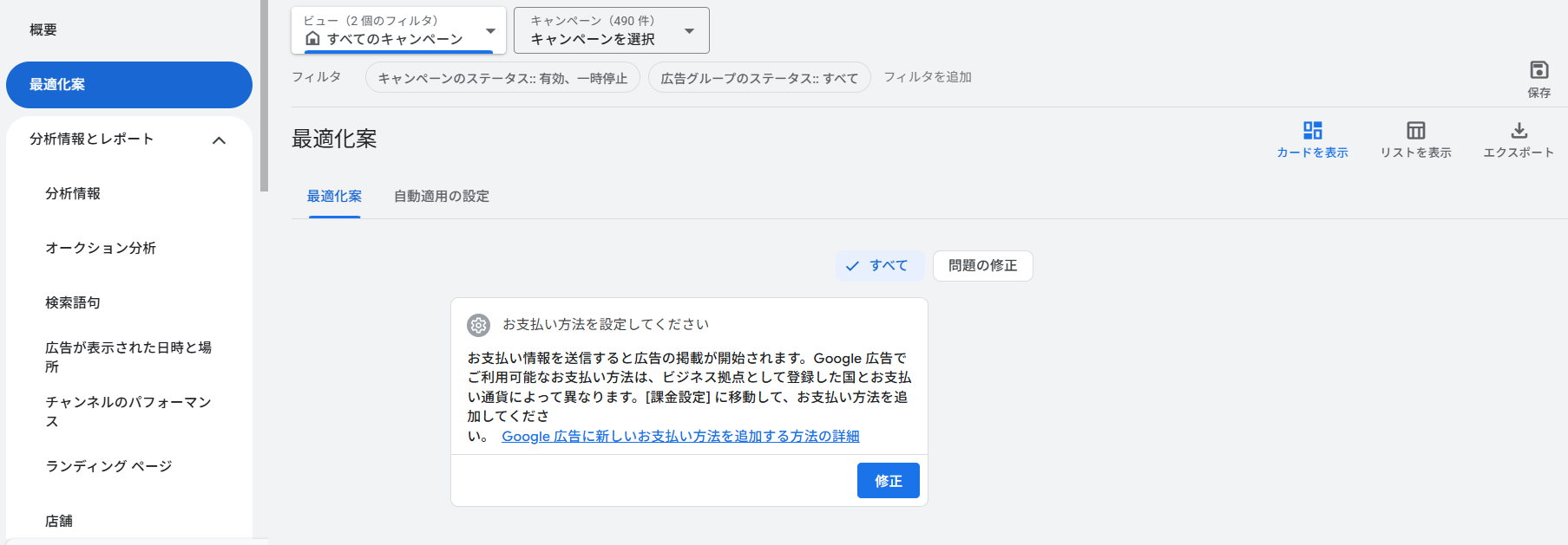 最適化案:GoogleのAIが提案する改善案を確認できる画面です。