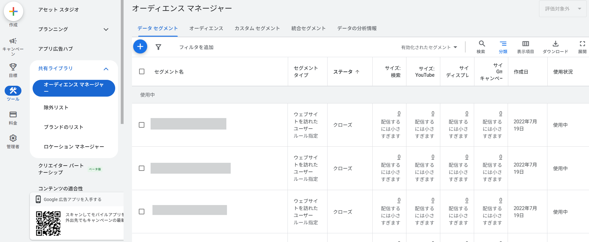 新しくセグメントリストを設定する場合は、管理画面左側メニュー内「共有ライブラリ」の「オーディエンスマネージャー」からも作成できます。詳しい作成方法は下記をご覧ください。