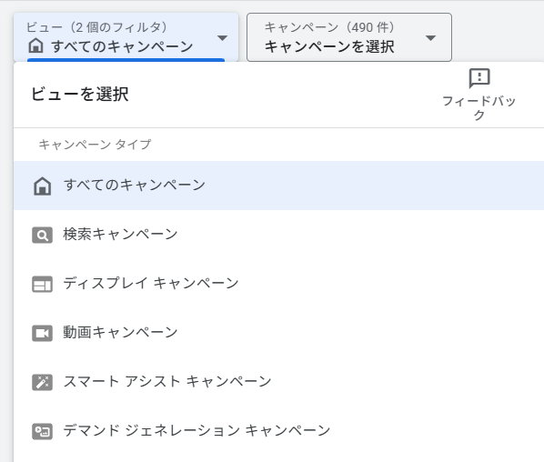 「ビュー」からキャンペーンタイプを絞ることもできます。