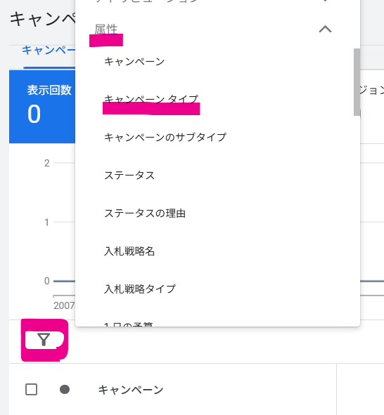 キャンペーンタイプの確認:検索キャンペーン、ディスプレイキャンペーン、動画キャンペーン、P-MAXキャンペーンなど、各キャンペーンのタイプを確認できます。「フィルタ」の「属性」内「キャンペーンタイプ」から、表示するキャンペーンタイプを絞れます。