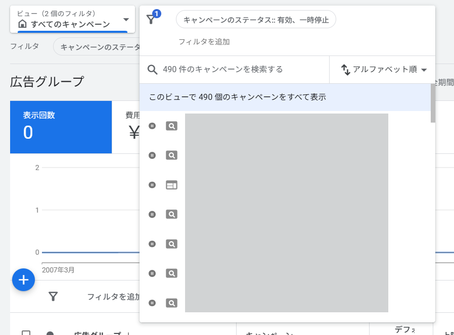 画面上の「ビュー」から、広告グループを表示したいキャンペーンを絞れます。すでにキャンペーン画面でキャンペーンを選択している場合も絞られて表示されます。