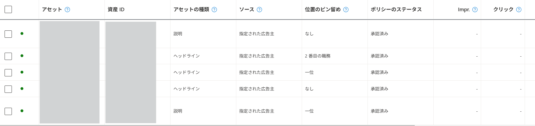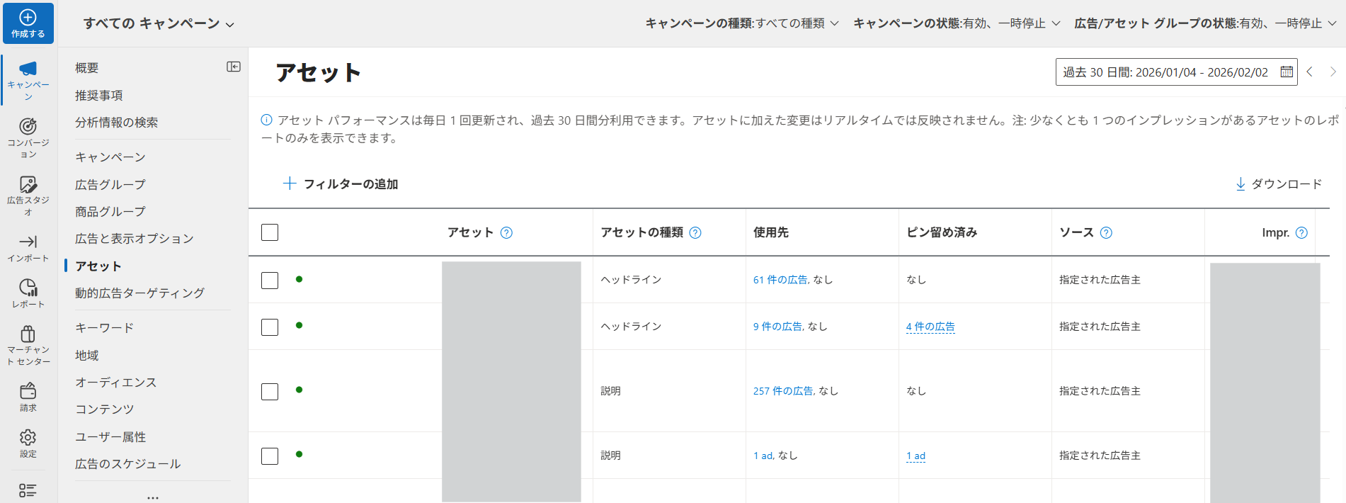 アセット:広告に含まれる要素ごとの成果を確認できます。確認できるのは広告の「ヘッドライン(見出し)」「説明」「画像」です。
