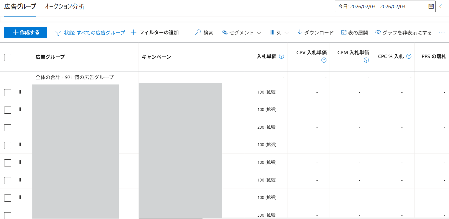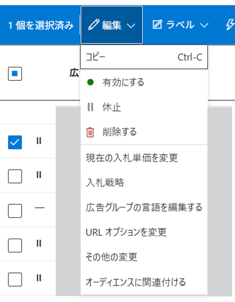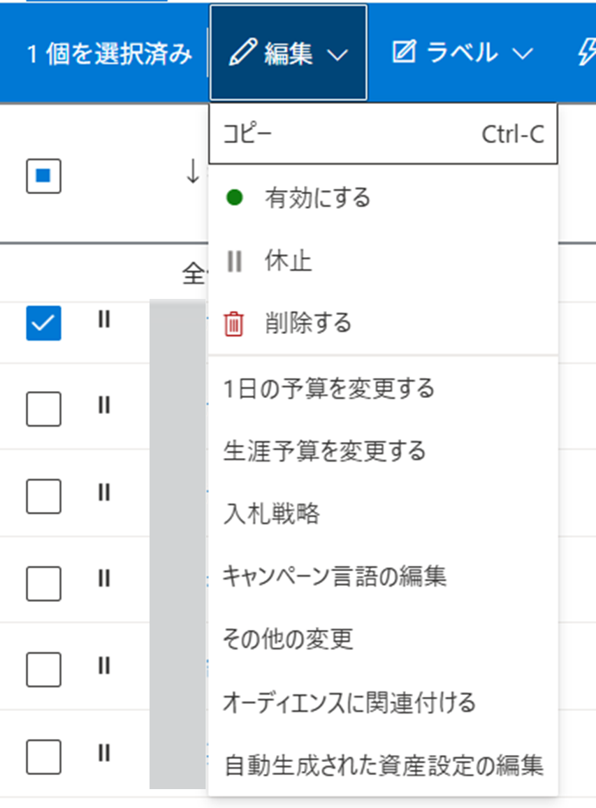 キャンペーン画面は、Microsoft広告を入稿・運用する際によく扱う階層です。ここでは主に以下のような操作をします。