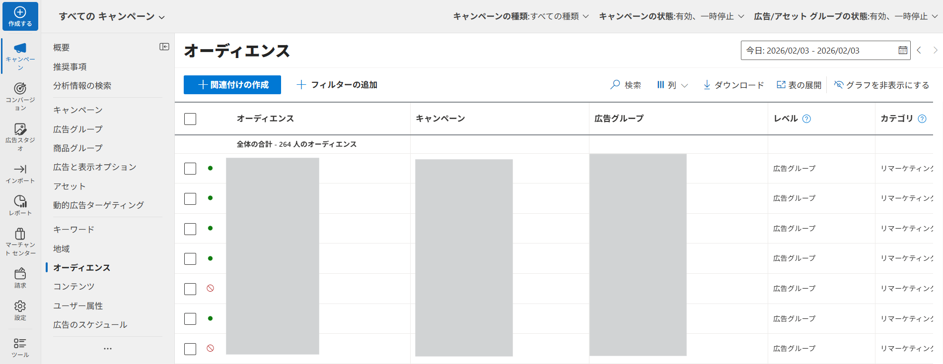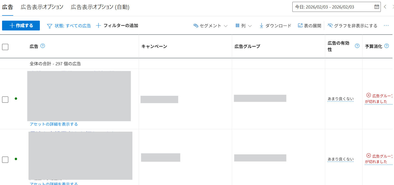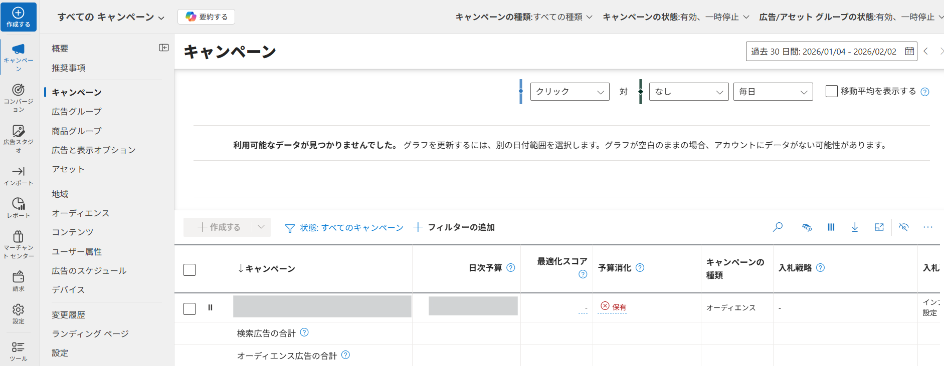 キャンペーン画面は、Microsoft広告を入稿・運用する際によく扱う階層です。ここでは主に以下のような操作をします。