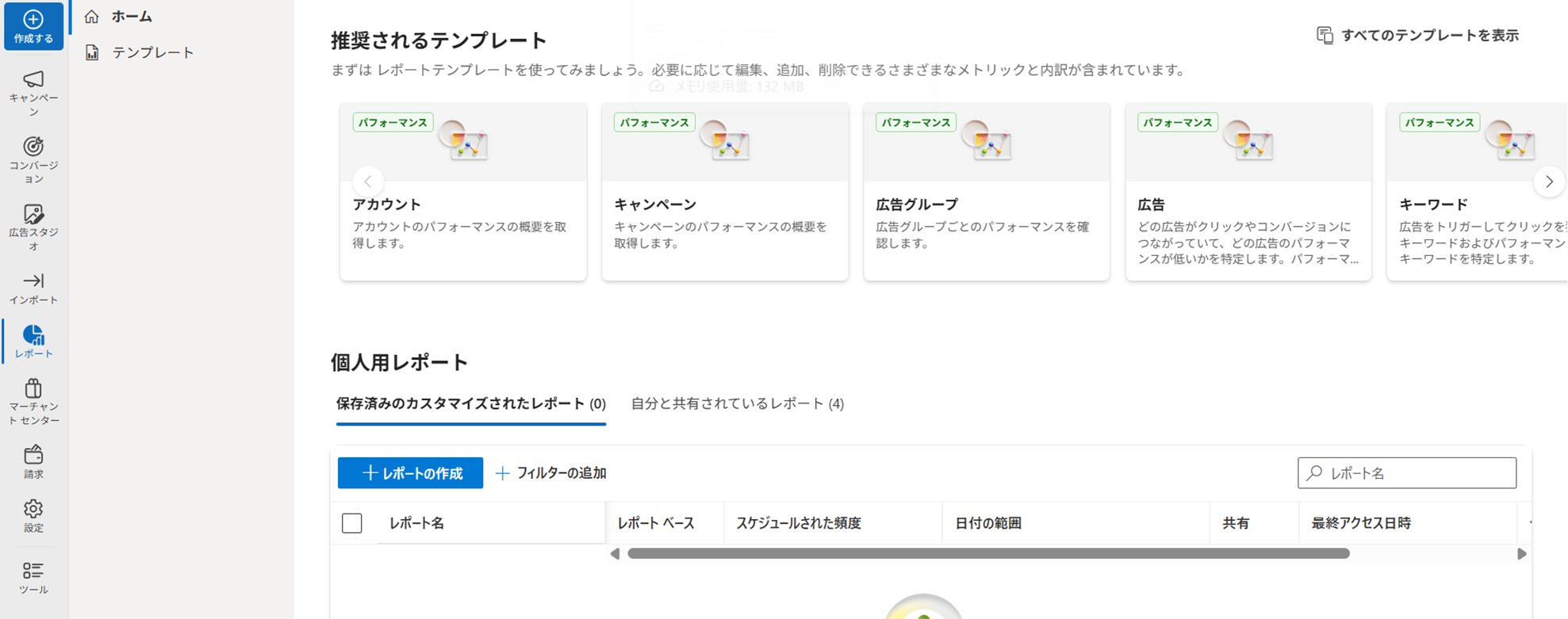 左側メニュー内の「レポート」では、広告の成果をレポートにまとめて出力・分析できます。よく使う機能をいくつかご紹介します。