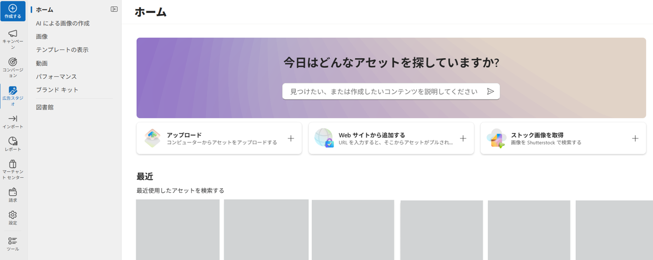 広告スタジオ:広告に使う画像や動画を管理する画面です。AIで画像を生成したり、テンプレートを使って画像を加工したりできます。