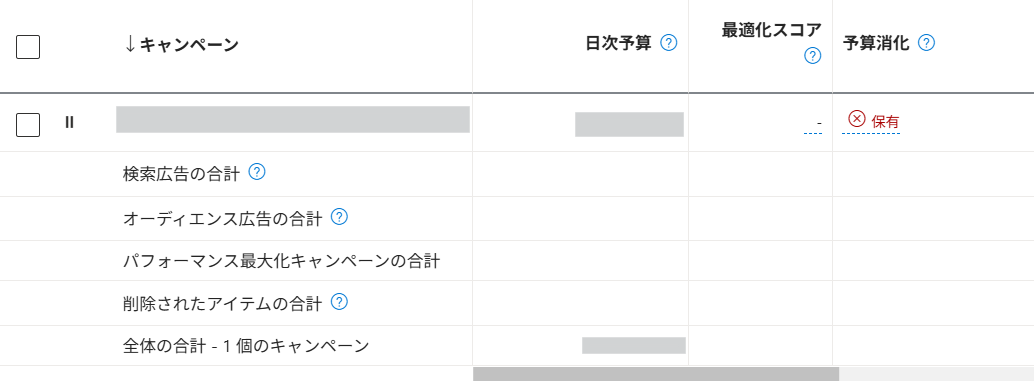 すべてのキャンペーンと、その主要指標を一覧で確認できます。各キャンペーンの状態(有効・一時停止など)や、費用、クリック数、コンバージョン数などを並べて比較できます。検索広告、オーディエンス広告、パフォーマンス最大化キャンペーンのように、キャンペーンタイプ別の合算も確認できます。