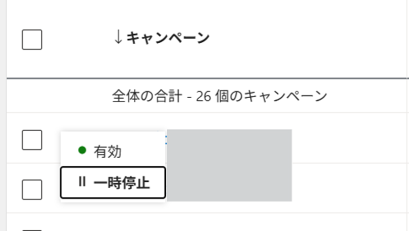 キャンペーンの配信を一時停止したり、再開したりできます。季節商品のキャンペーンを一時的に止めたい場合や、予算の都合で配信を調整したい場合に使用します。
