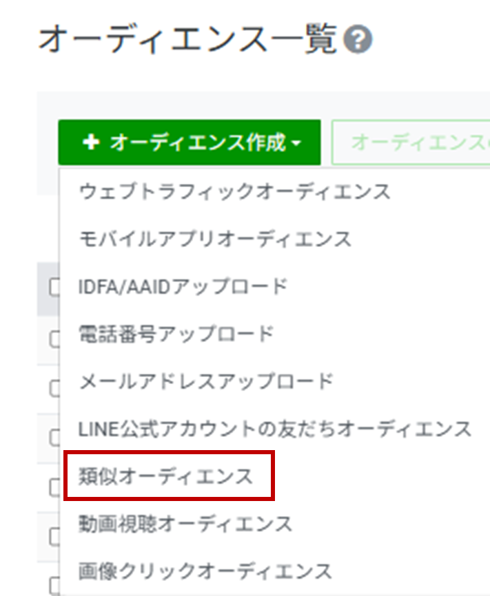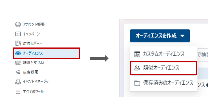 管理画面で作成する場合、左側メニューの「オーディエンス」内の「オーディエンスを作成」から「類似オーディエンス」を選択します。