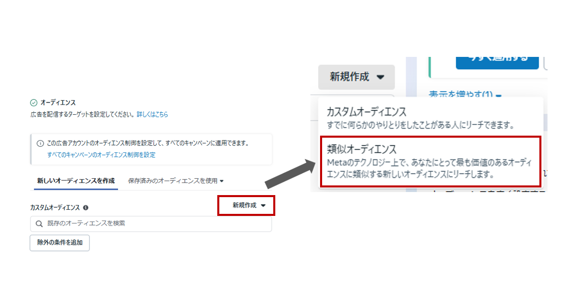 「+オーディエンス作成」を開き、「類似オーディエンス」を選択します。