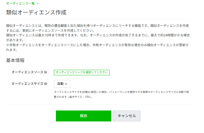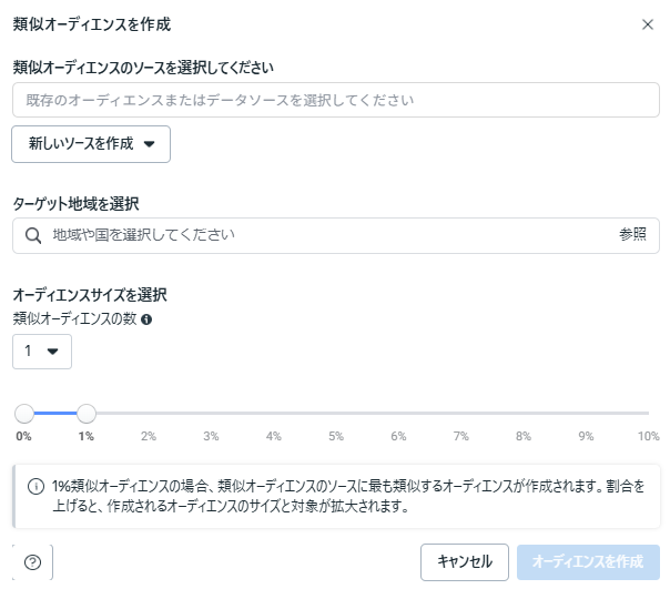 元にしたいオーディエンスソースとオーディエンスサイズを選択します。ソースを用意していない場合は、先程の「+オーディエンス作成」から作成しておきましょう。
