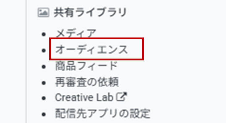 管理画面左上のメニューを開き、「共有ライブラリ」内「オーディエンス」を選択します。