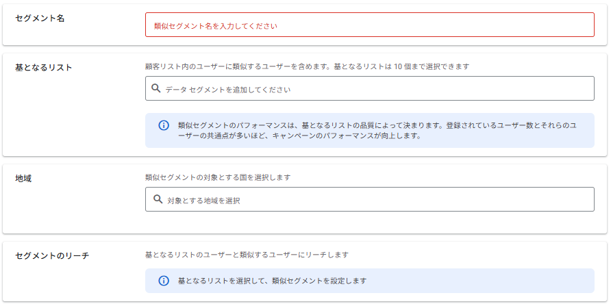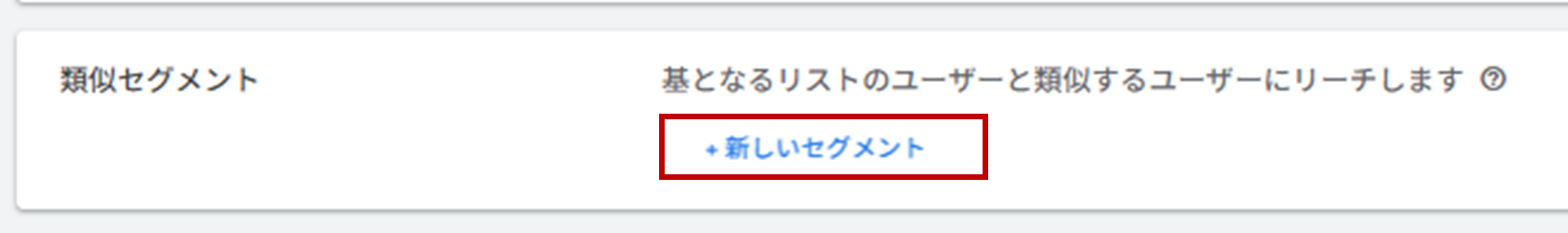 「+新しいオーディエンス」をクリックするとオーディエンス作成画面が開きます。その中の「類似セグメント」項目から類似リストを作成できます。