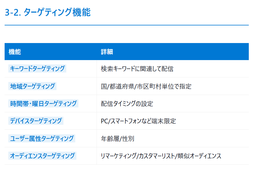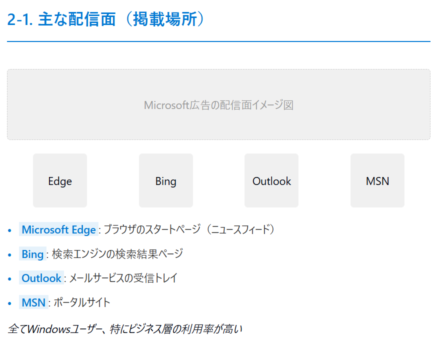 もちろん数値だけでなくあらゆるデータを資料の形にレイアウトしてくれます。それをそのまま使っても良いし、それを参考にPowerPointをレイアウトするのも良いでしょう。下記はClaudeが出力したMicrosoft広告に関するまとめ資料の例です。