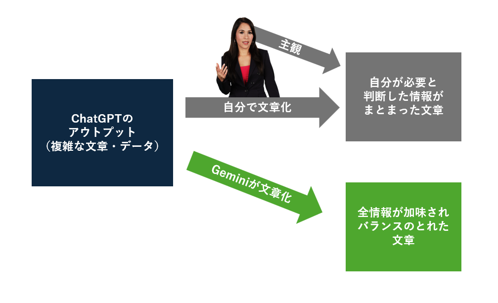 機械的で緻密な分析が得意なChatGPT(o3)が出力した複雑な分析結果をGeminiに読ませて「初心者にもわかるような文章でまとめて」と指示すると、必要な情報をすべて加味したうえで表現だけをカンタンにした文章を出力してくれるのでおすすめです。※そのままChatGPTに文章化まで頼んでもいいのですが、Geminiの方が初心者向けの文の出力には向いています。